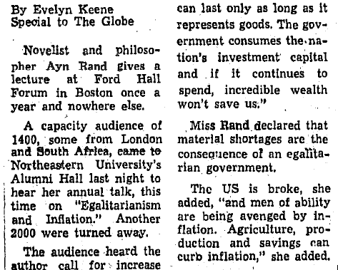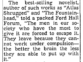 right: Under the headline “Socialism Brain-Killer —Ayn Rand,” the April 20, 1964, Boston Globe (pg. 34) began a three-paragraph story by stating, “Novelist Ayn Rand said Sunday that demands of socialistic government are forcing the best minds of America and the world to abandon their work”. The second paragraph is reproduced here. | ![]() |
