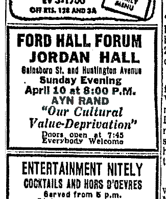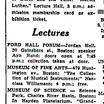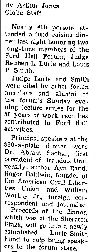 • Ayn Rand spoke at a dinner where the Ford Hall Forum raised money to continue its operations.