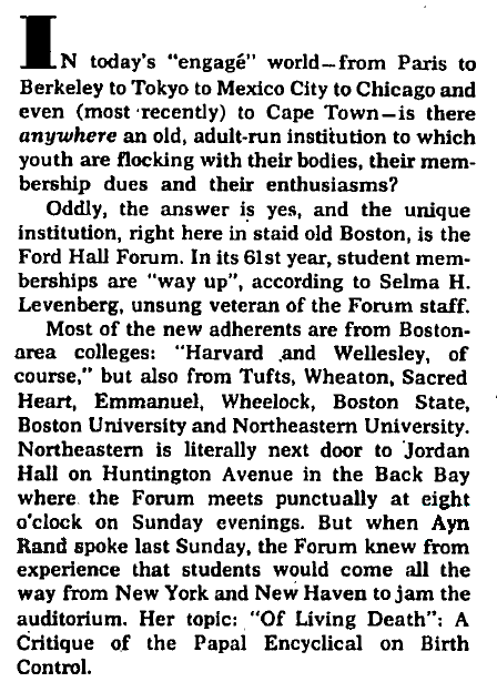 A well-illustrated, multi-page article about the venue—titled “1908-1968: Ford Hall Forum: Boston at Its Best”—in the December 15, 1968, issue (pg. A6) told in its third paragraph that organizers knew Ayn Rand would draw a huge crowd. (The first three paragraphs of the article are reproduced here.) |