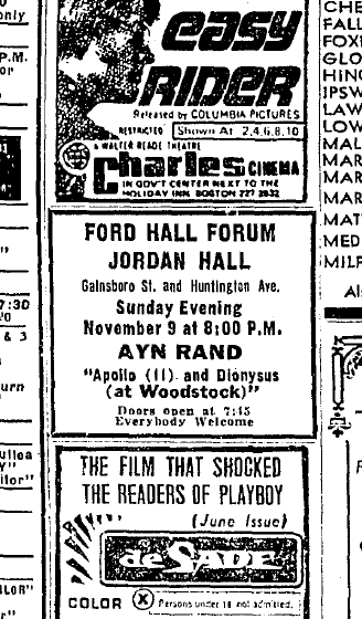 Ayn Rand’s 1969 speech has always been published by the title “Apollo and Dionysus,” but here two parenthetical additions are included. That “Woodstock” is the boldest word is fitting for an effort to draw a crowd, as the concert was a cultural touchstone of the time. The advertisements directly above and below reflect the new indulgence. Advertised elsewhere on the page was a play about J. Robert Oppenheimer, the atomic-bomb scientist whom Ayn Rand drew on in devising the character of Dr. Robert Stadler. From the November 8, 1969, issue, pg. 20. |