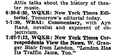 The relationship between Ayn Rand and Pacifica station WBAI will be told here through newspaper clippings. All of the clippings in this section are from The New York Times. Page numbers refer to the newspaper’s page numbers on the specific dates indicated.