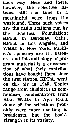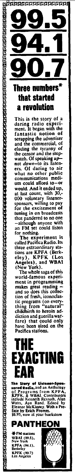The Pacifica Foundation book The Exacting Ear was published by Pantheon in May 1966. The New York Times reviewed the book in its July 3, 1966, issue (pg. 141). The section of the review shown below names the stations operated by Pacifica Foundation and names two of the commentators whose voices and views were heard on the station; one of them is Ayn Rand. (Station KPFK in Los Angeles, also named in the ad and the review, had in the early 1960s broadcast Ayn Rand talks, including “Is Atlas Shrugging?” on July 1, 1964.) | ![]() |