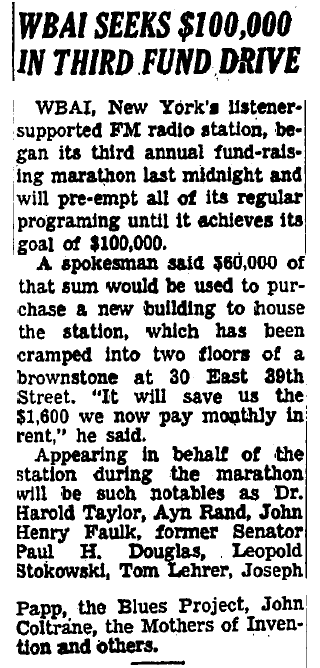 right: WBAI has—as have so many other broadcast outlets supported by their audiences—used its air-time to ask its listeners to provide financial support to it. A May 2, 1967, Times story (pg. 94) reports on the fundraising effort then underway. Ayn Rand is named as among those who would be heard on the station during the fundraising period.