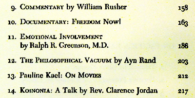 Pacifica Foundation filed the copyright on the book, giving the date of publication as May 26, 1966, and on the registration form made this statement regarding any limitations on their claim of copyright: “Copyright is claimed in all matter except FCC decision and Chapter 17, ‘From an Autobiographical Novel by Kenneth Rexroth’.” If this is correct, then Pacifica obtained copyright from Ayn Rand, and any new effort to reprint the article by Ayn Rand’s estate, Leonard Peikoff (her legal heir, and legal successor to her estate), any successor to Peikoff, any publisher associated with any of the previous, or any publisher acting on his own, would have to arrange clearance through Pacifica.