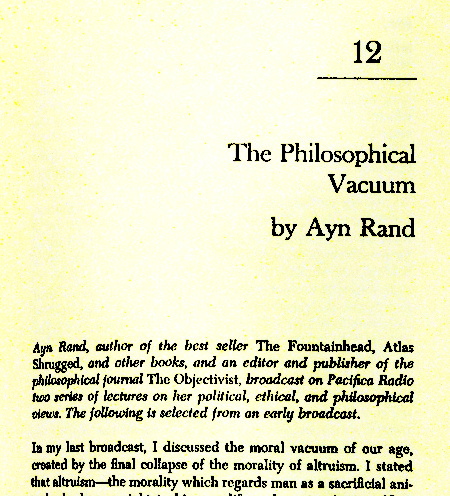 The book provides a respectful introduction about Ayn Rand. The editorial remarks don’t state the essay broadcast date, only that it was “early” in Ayn Rand’s association with Pacifica. The essay covers a gamut of philosophic subjects—altruism, pragmatists, logical positivists, perception, academia—and thus is similar in comprehensiveness to some of Ayn Rand’s earlier writings for The Objectivist Newsletter (begun 1962). (Later, her non-fiction had narrower scope in each writing.) Although this article discusses the same subjects which Ayn Rand did in some of her other writings of the time, this is an entirely different article from any published in any of Ayn Rand’s periodicals. She did not include this article in any of the anthologies she prepared from her writings, and in the years since her death, her estate and its authorized organizations have not reprinted it either. This article has remained exclusive to the book published by Pacifica Foundation (long out-of-print). | ![]() |