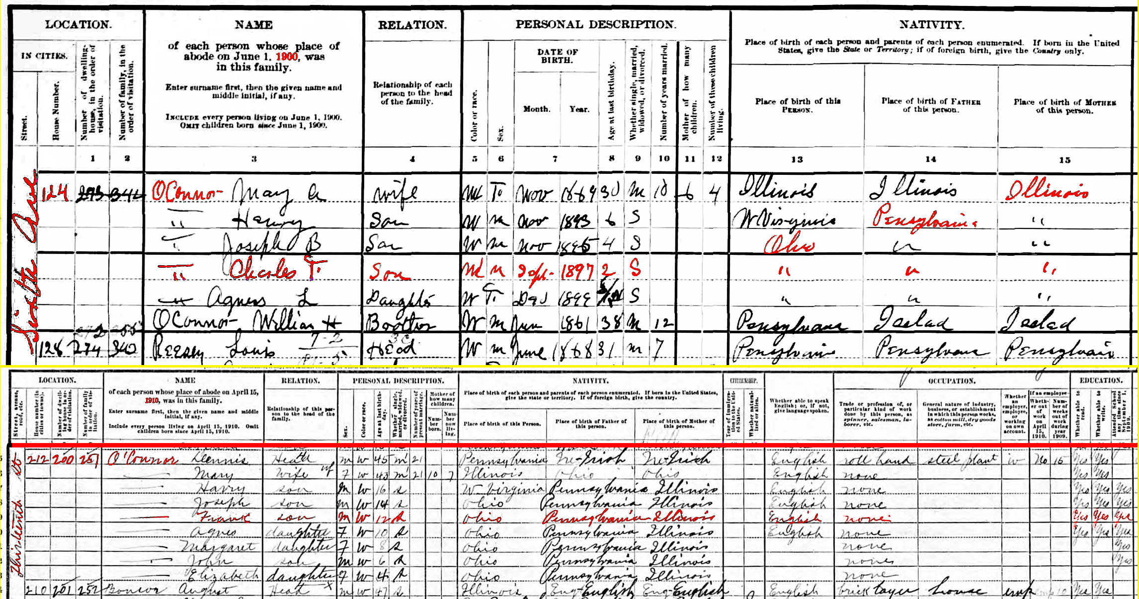 Owing to the other OConnors appearing at the top of the listings on this page, I did not have to move the header column to have it shown atop the OConnors. However, on the 1910 census page, I did make such a move. The red line demarcates where I moved the header to directly above the OConnor listings. In the 1910 census, Frank is now listed as Frank, hes age 12, his trade or profession was then none, but Yes answers were given to his being able to read, write and having attended school since 1900.