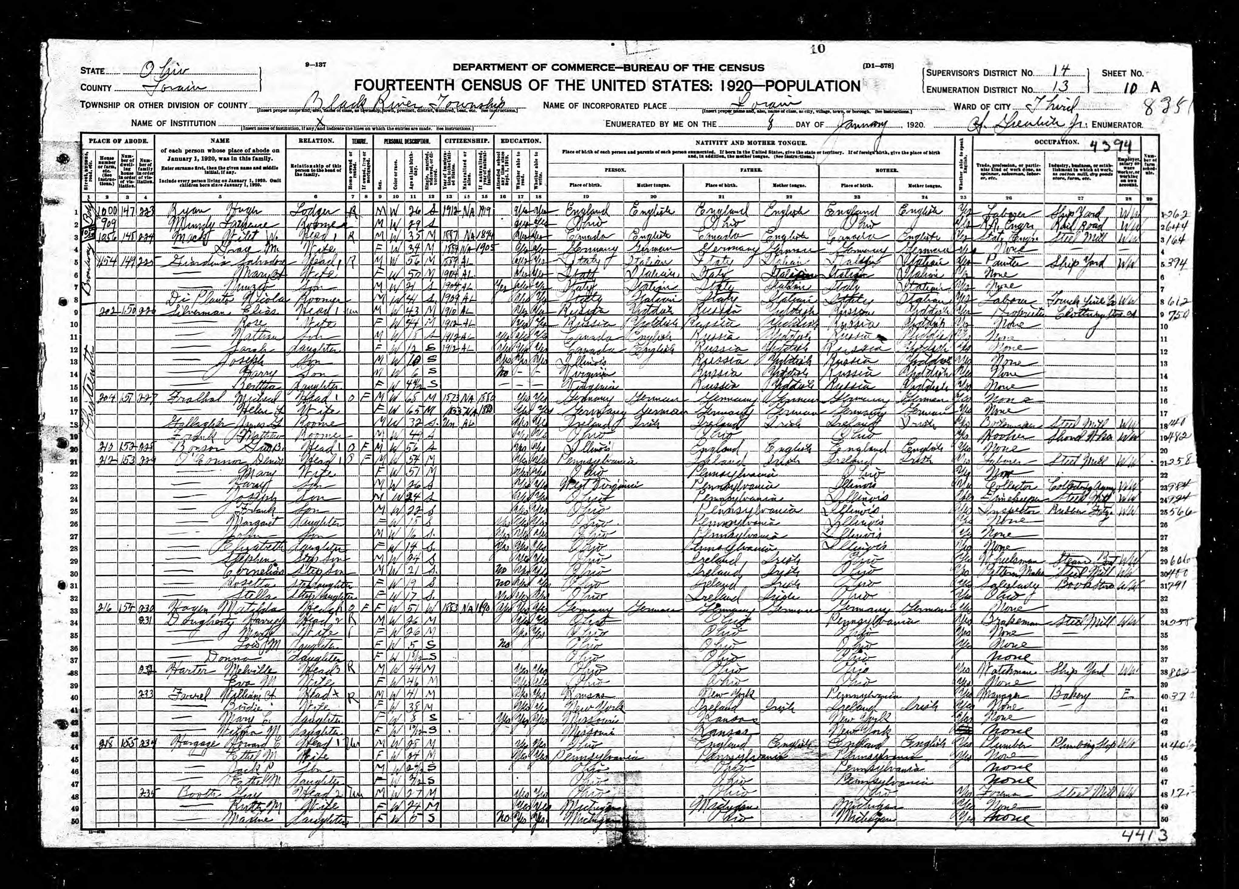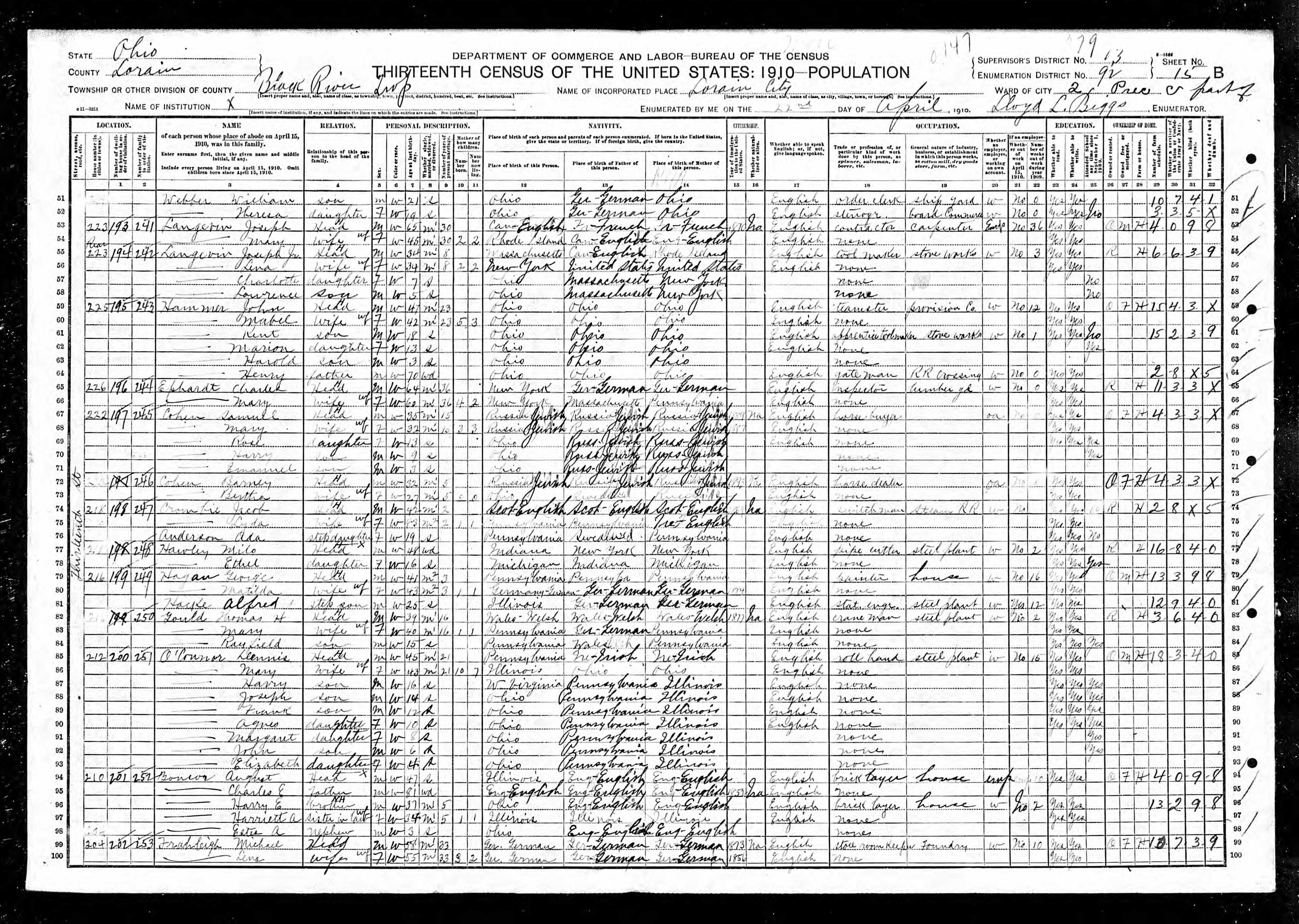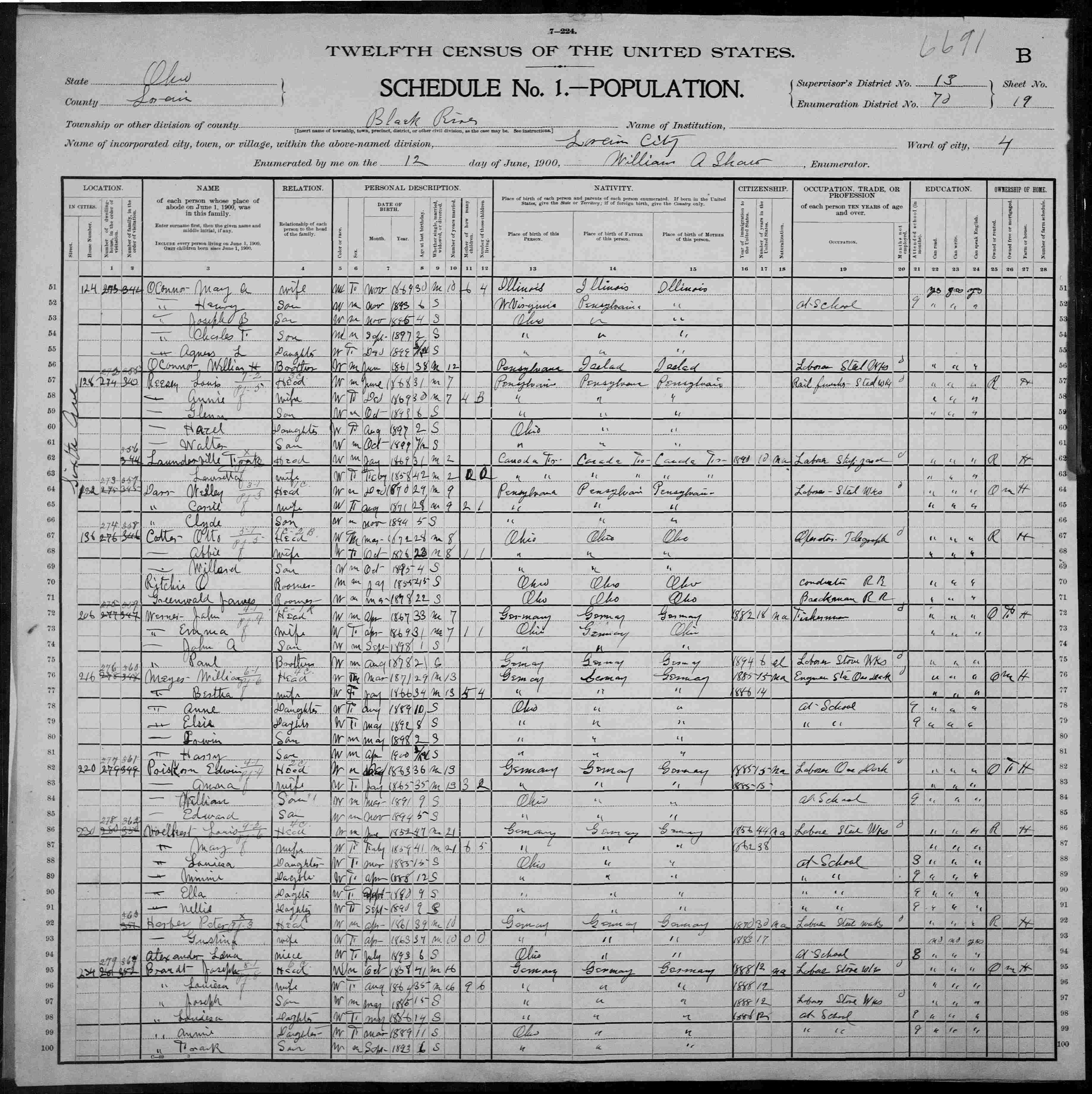 Frank OConnors residence when he was age two can be ascertained from census records of year 1900. Frank was still in the Ohio city of Lorain when age 22 in 1920.