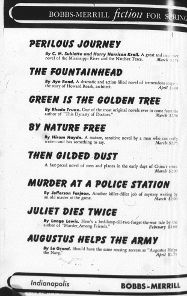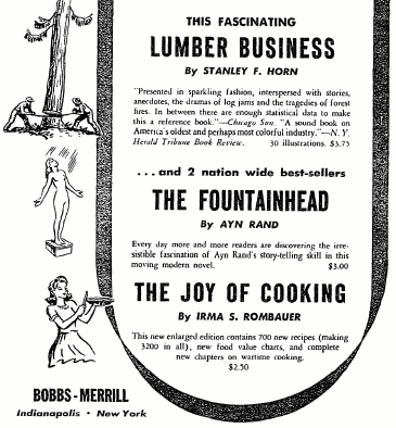The Washington Post of December 4, 1946, carried this ad from Bobbs-Merrill with five titles, including The Fountainhead. |