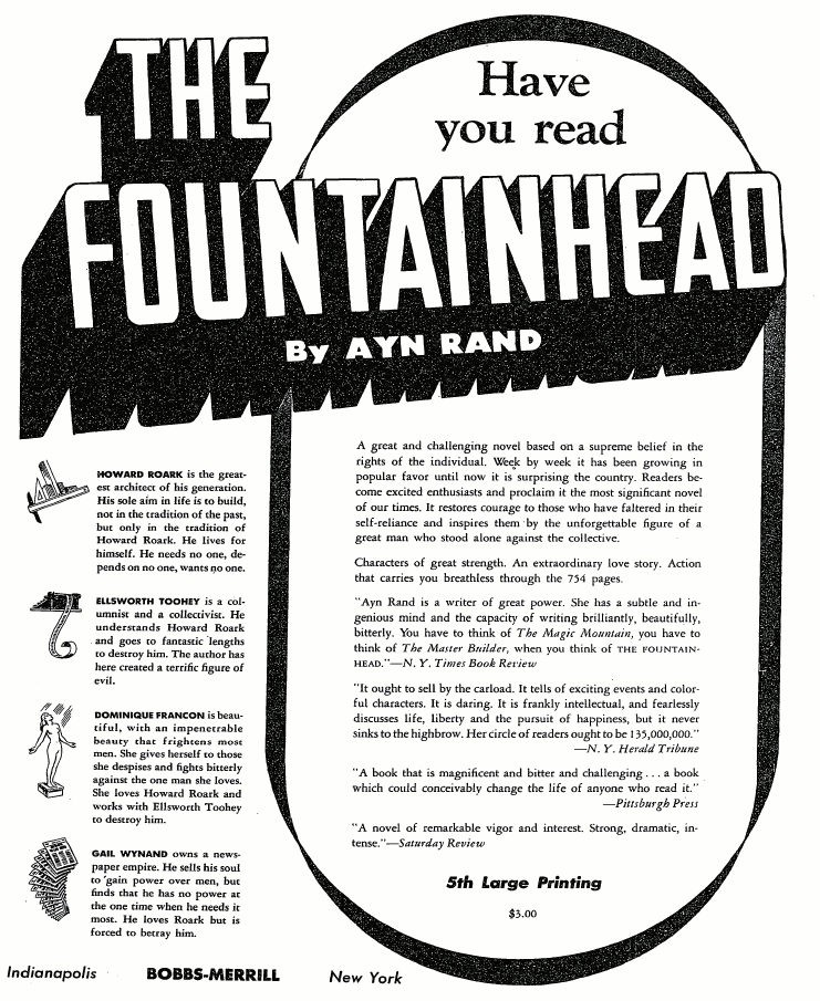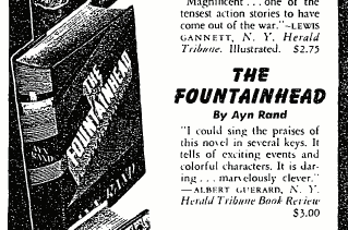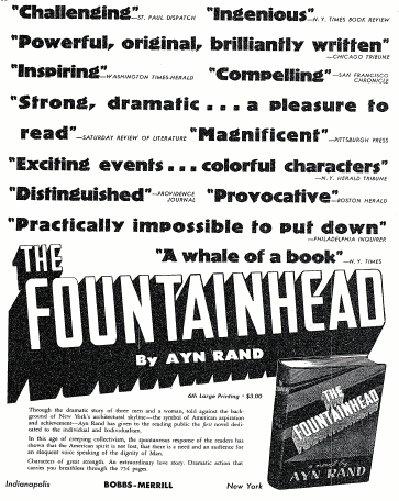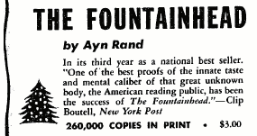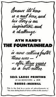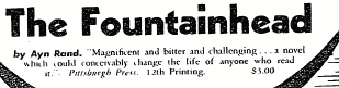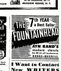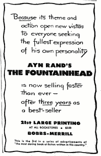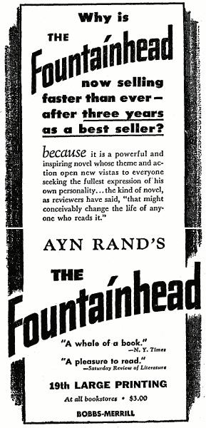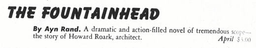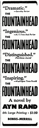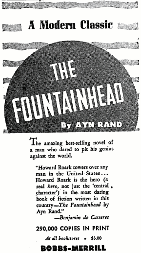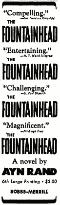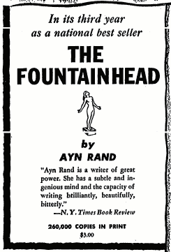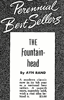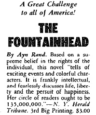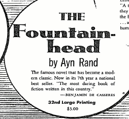 ![]() The small part of the ad devoted to The Fountainhead is reproduced here at a larger scale, below. |