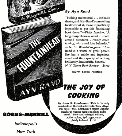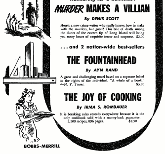 The New York Times of December 7, 1947, carried this Bobbs-Merrill ad spotlighting four new books, with less space allotted to three books under the header of “Perennial Best Sellers,” among them The Fountainhead. (Image at right is an enlargement of the portion about The Fountainhead.) |
