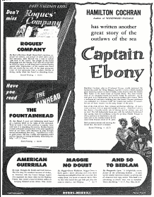 ![]() ![]() The aforementioned Albert Guerard is quoted concerning The Fountainhead in the Bobbs-Merrill ad shown here. Again, Bobbs-Merrill prepared and ran an ad featuring five of its books. The full ad is at left, the portion for The Fountainhead is reproduced at larger scale at right. This ad appeared in The New York Times of July 11, 1943. |