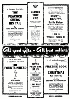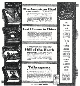A small ad in the Chicago Tribune of November 6, 1949. Though small, the ad is limited to the one book. The surrounding ads are from other advertisers. | The New York Times and the Chicago Daily Tribune of December 4, 1949, carried a Bobbs-Merrill ad with ten titles, each receiving roughly equal space. Shown here is the section on The Fountainhead. |