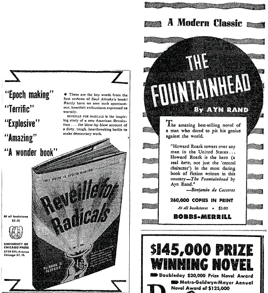 In today’s culture, there is a stark contrast between the ideology of Saul Alinsky—manifested in the group warfare and unscrupulous political moves orchestrated by the White House of President Obama—and Ayn Rand—whose philosophy of limited government and self-sufficiency has inspired and been embraced by the Tea Party (founded in its present incarnations in 2009). Six decades ago, both Alinksy and Rand were emerging on the cultural landscape, and on at least one occasion a book by each was advertised side-by-side with the other. The Alinsky ad was positioned to the left of Ayn Rand, and Ayn Rand was positioned to the right of Alinksy. Considering the ideological connotations of the terms “left” and “right,” the ad placement here was appropriate.