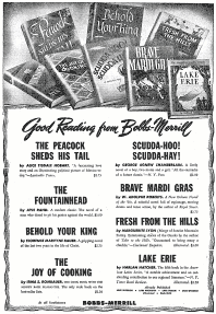 ![]() Like the two ads above, this ad from Bobbs-Merrill in The New York Times of November 14, 1943, has such superlatives as “challenging,” although this ad does improve on the other two by including ad copy (albeit in its small print) offering indications of the reasons why the book warrants its praise. |