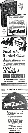 These ads appeared in The Washington Post of January 27, 1946. A near-identical version of the Fountainhead ad appeared in The New York Times of March 13, 1946, where the ad differed in that the sales figure of 260,000 in the earlier ad was revised upward to 290,000 a mere six weeks later.