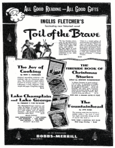 Large Bobbs-Merrill ads like this one appeared December 2, 1945. The ad at above left is from the Chicago Daily Tribune; a similar ad appeared in The New York Times the same day. One-sixth of the space was devoted to The Fountainhead. That portion is shown in larger scale, immediately above center. | In another multi-title ad from Bobbs-Merrill with a “good gifts” theme, The Fountainhead was again accorded space, but different ad copy from two weeks before. (The New York Times, December 16, 1945) |