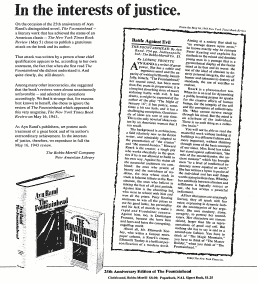 Bobbs-Merrill (publisher of hardbound editions of The Fountainhead) and New American Library (publisher of the paperback counterpart) joined forces for an ad to protest The New York Times’s peculiar gut-response review of The Fountainhead which appeared on the occasion of the 25th anniversary of the novel. (Both publishers issued 25th Anniversary editions with a new introduction by Ayn Rand.)![]() |